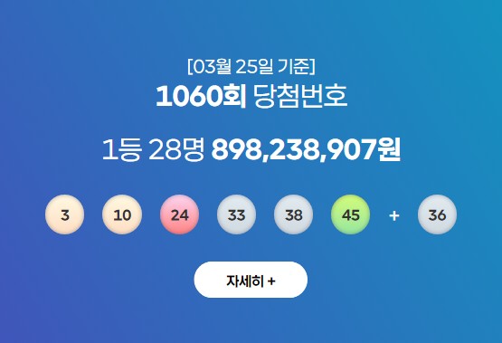 # 로또 1060회 당첨번호 3, 10, 24, 33, 38, 45 | 보너스 볼 36 # 당첨 금액 # 1등 당첨 금액 1등 28명 898,238,907원 # 2등 당첨 금액 2등 96명 43,664,392원 # 3등 당첨 금액 3등 4,593명 912,646원 # 1055회 ~ 1060회 로또 미출현 번호 최근 5주 동안은 이와 같은 번호들이 나오지 않았습니다. 로또 미출현 번호를 참조하셔서 로또 구매를 하시면 당첨 확률이 조금 더 상승합니다. 구매시 인터넷 로또 구매로 취미 삼아 한 번씩 구매해 보시는 건 어떠신가요? # 로또 1060회 당첨 예상번호 금일 로또 1060회 당첨번호가 나왔습니다. 다들 좋은 결과 있으셨나요? 로또 1061회 당첨번호, 1등 예상번호를 추출해주는 무료 플랫폼입니다. 최..